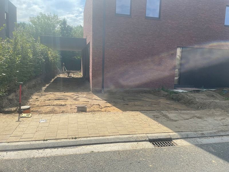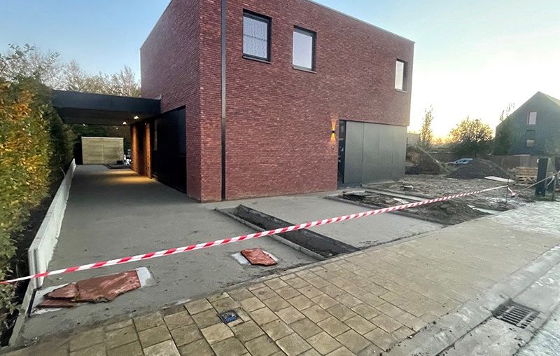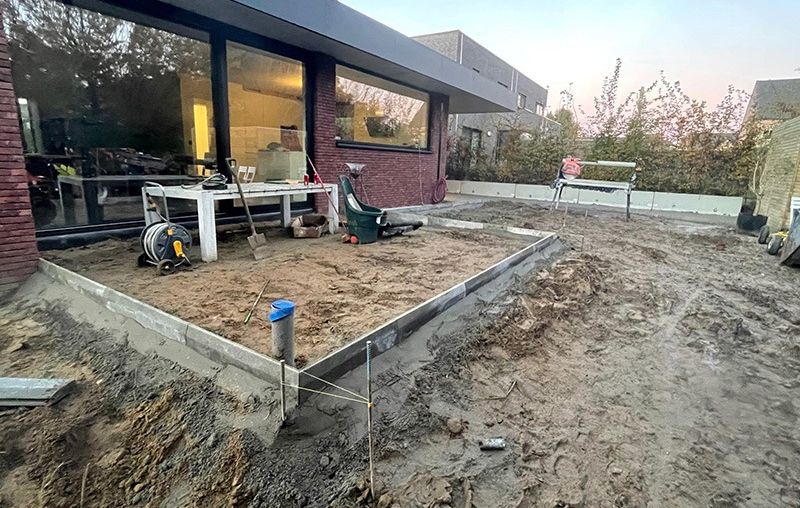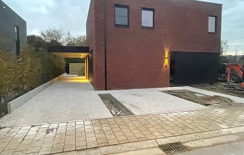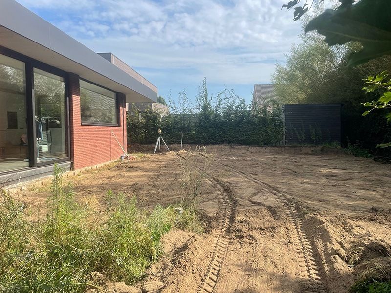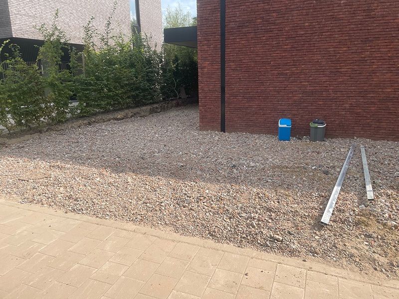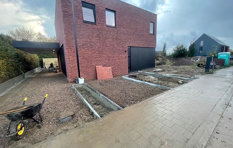 Moderne tuin met strakke lijnen aan nieuwbouwwoning.